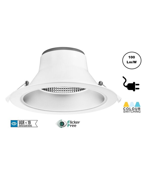 Dieser sehr hochwertige Reflektor-LED-Downlighter 20w besteht aus Aluminium mit weißem Gehäuse. Die gewünschte Lichtfarbe lässt sich einfach mit dem Schieberegler an der Rückseite der Leuchte einstellen. Der zurückgesetzte Reflektor sorgt für geringe Blendung (UGR<19) mit einem Ausstrahlungswinkel von 60°.