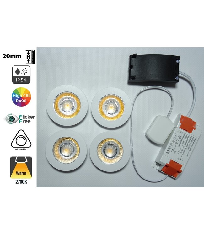 Deze complete Inbouw LED Spot Set 4x3w 2700K Warm wit is een zeer unieke led spot. Deze Inbouw LED spot Set bestaat uit 4x 3w LED Spots dimbaar met slechts 20mm hoog. Hierdoor zijn de inbouw led spots overal toepasbaar. Dankzij de IP54 normering kunnen deze Inbouw LED spots ook gebruikt worden in badkamers of vochtige ruimtes. Ook zeer geschikt voor montage in meubels, onder keukenkastje etc.
