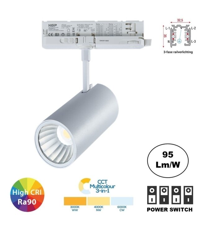 Deze zeer hoogwaardige kwaliteit LED Rail spot heeft een zeer luxe en strak afgewerkt design. Dankzij het moderne design is de rail spot een eyecatcher in elke winkel, kantoor of restaurant. Het armatuur wordt standaard geleverd met flash-free/flikkervrije KGP LED driver welke is geïntegreerd in de adapter. Middels dip-switch/powerswitch is de wattage in stapjes van 50ma instelbaar, het instelbereik is van 340 (15W) tot 750ma (29W). De reflector heeft een standaard 60° bundel. Bij de lamp wordt een 36 graden bundel bij geleverd (optioneel kan je deze door ons laten voor monteren).
